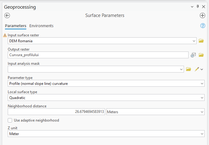 Care au fost setarile instrumentului Surface Parameters pentru a calcula Curbura Profilului: