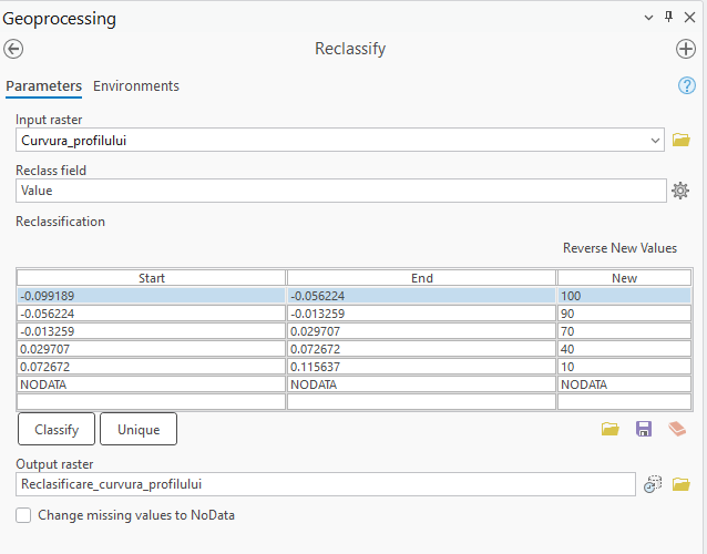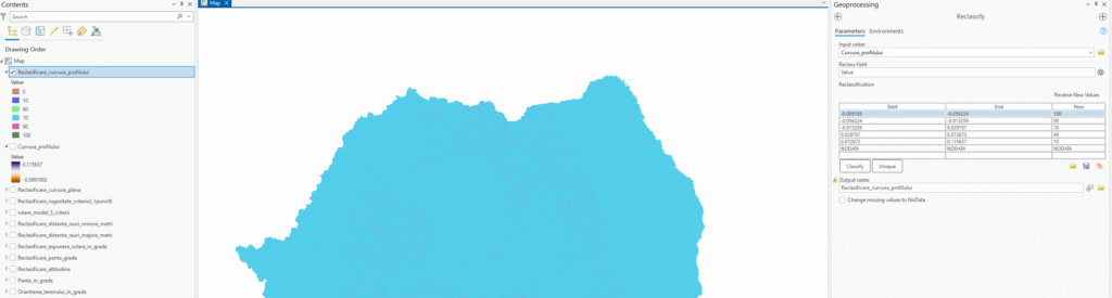 Setarea intervalelor de mai sus a reușit după încercări multiple. ArcGIS Pro nu a acceptat valorile din Lista Criteriilor. A fost nevoie să le ajustez, astfel încât ArcGIS Pro să poată face reclasificarea lor. În rezultatul final se poate observa că rularea instrumentului Reclassify, în ciuda inputului de 5 clase, a generat 6 clase.