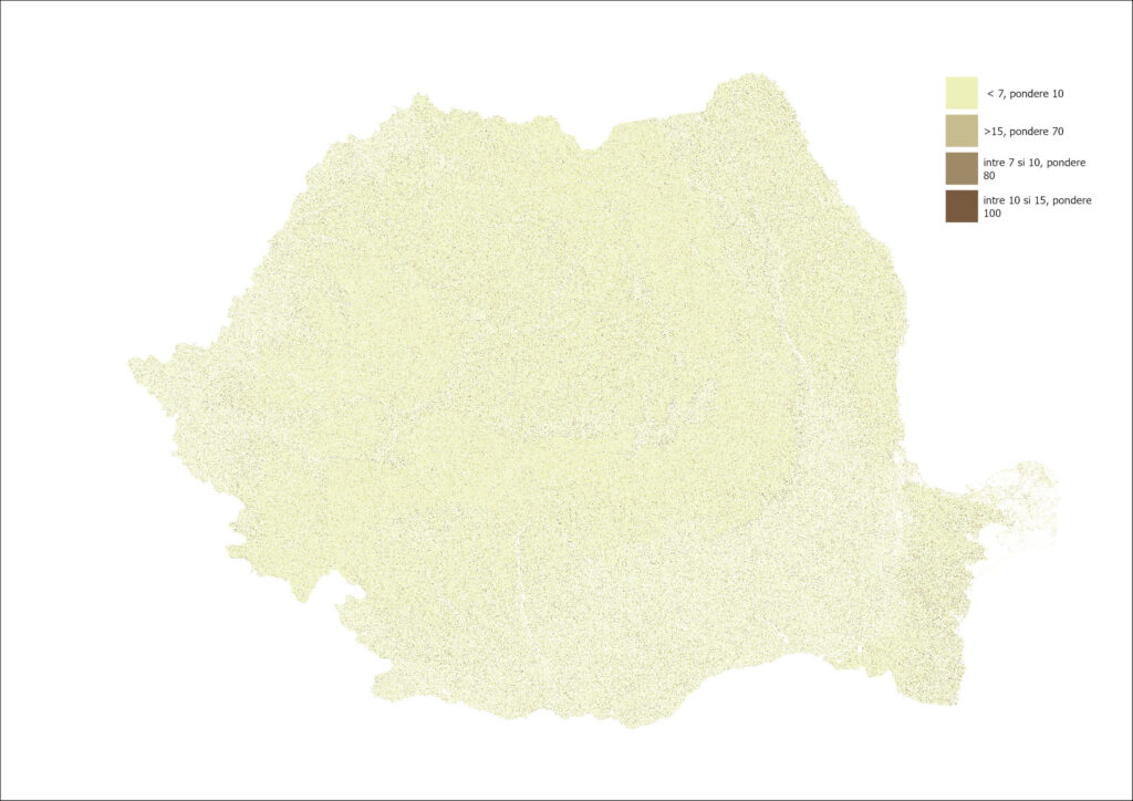 Această hartă criteriu a fost cel mai greu de obținut până în acest moment. A trebuit să fac până la nu mai puțin de 4 hărți intermediare înainte de a aplica la final instrumentul Reclassify pentru a atribui ponderile claselor pe care le-am dorit.