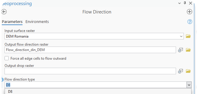 Primul instrument folosit a fost Flow Direction, cu urmatorii parametrii: