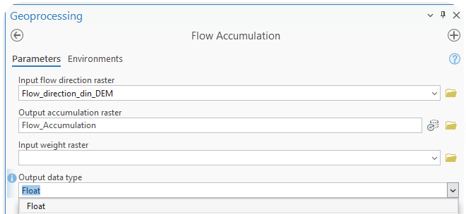 Pe harta astfel obținută din Flow Director, am aplicati instrumentul Flow Accumulation, cu urmatorii parametrii: