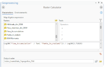ArcGIS tool: Topographic Wetness Index (uneltele Hydrology combinate cu Raster Calculator)