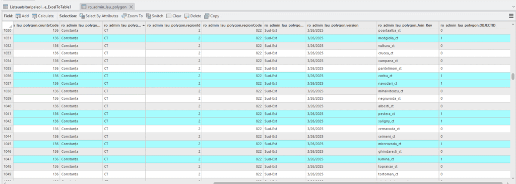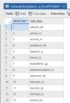 A urmat Join între coloana normalizată din harta cu UAT-uri și coloana normalizată din fișierul excel importat. Din 216 uat-uri din fisierul excel importat, au facut join cu succes 196. S-au pierdut 20 de uat-uri la operațiunea de Join. Am dat valoarea 1 câmpurilor care au făcut Join cu succes și 0 la celelalte. Am obținut o harta raster, poligonală, cu UAT-urile care au situri paleolitice marcate dinstinc.