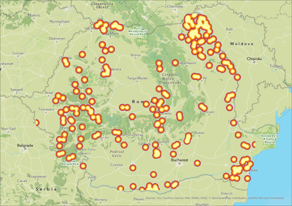 Setarea instrumentului Kernel Density: output cell size 30, Search Radius (Bandwidth).